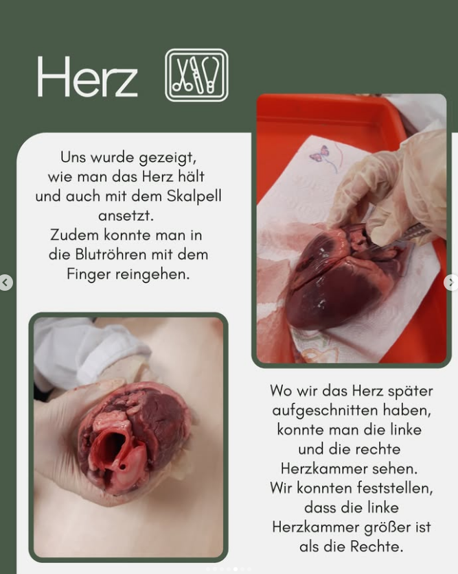 Danach haben wir uns die Herzen vorgenommen. Uns wurde gezeigt, wie man das Herz hält und auch mit dem Skalpell ansetzt. Zudem konnte man in die Blutröhren mit dem Finger reingehen und wo wir