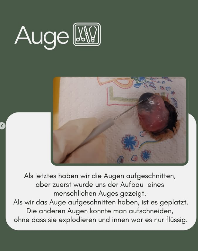 Als letztes haben wir die Augen aufgeschnitten, aber zuerst wurde uns der Aufbau eines menschlichen Auges gezeigt. Als wir das Auge